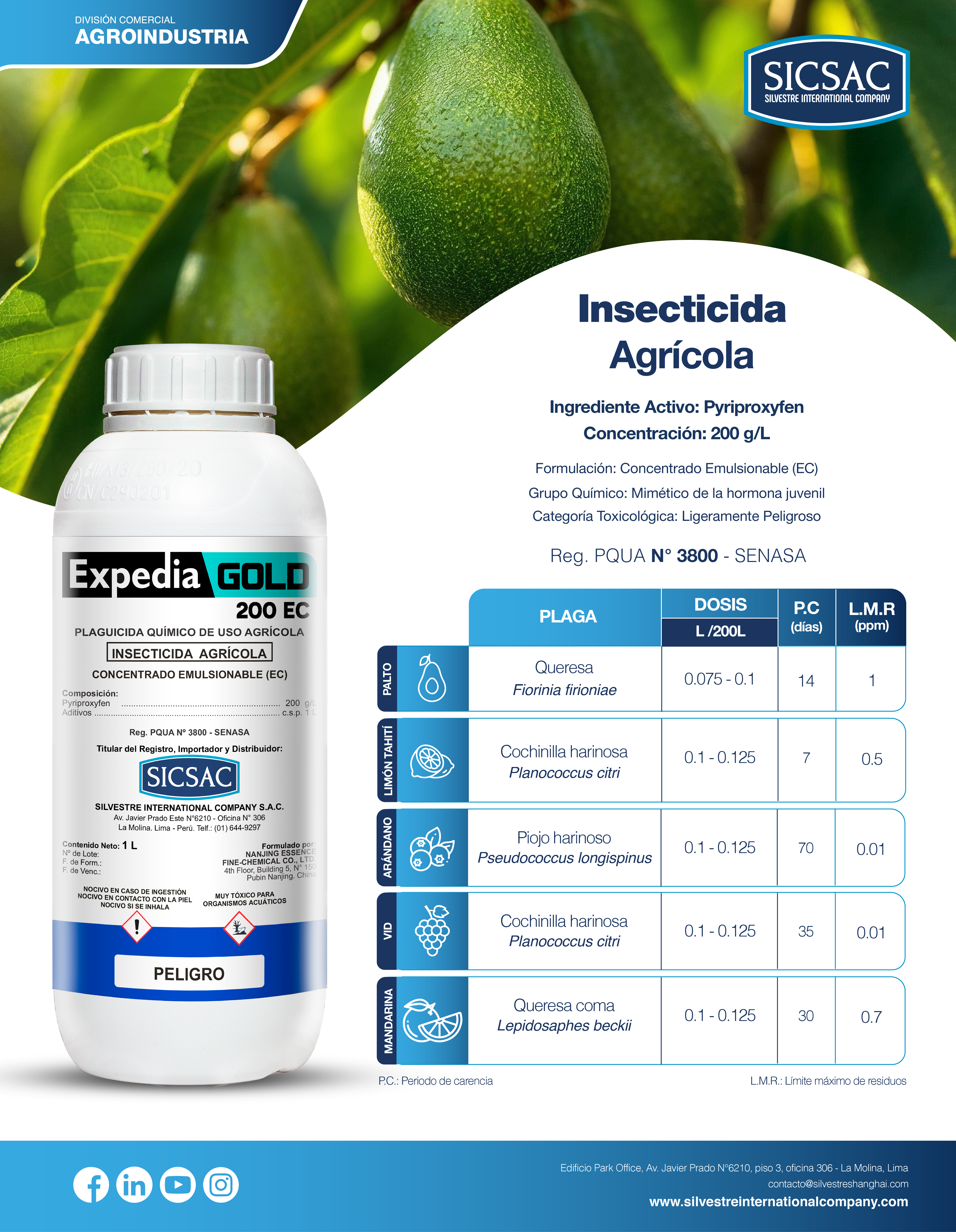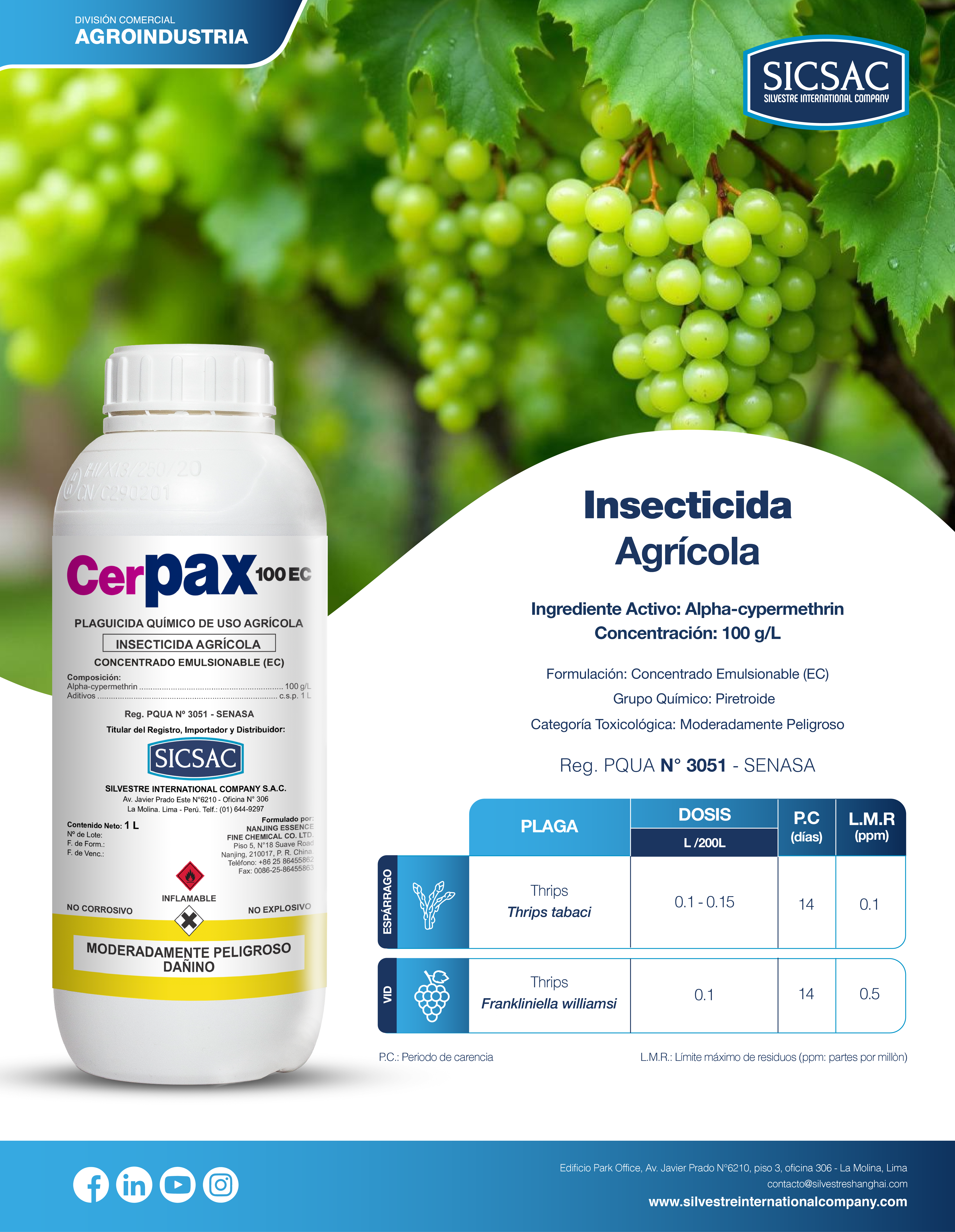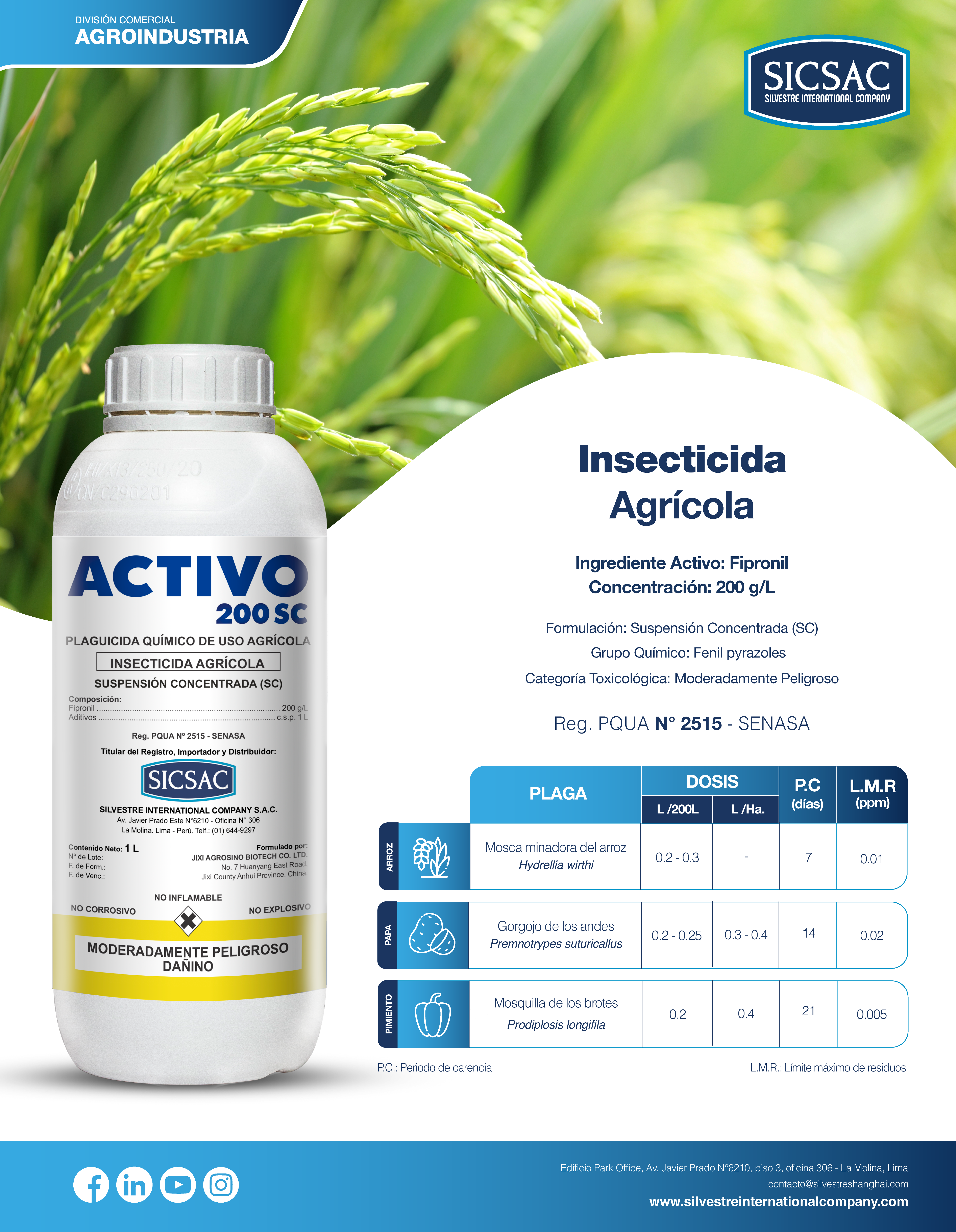 Insecticida con un excelente efecto de contacto sobre un gran rango de plagas, una vez expuestos al tratamiento los insectos colapsan inmediatamente al ser afectado su sistema neuro muscular.