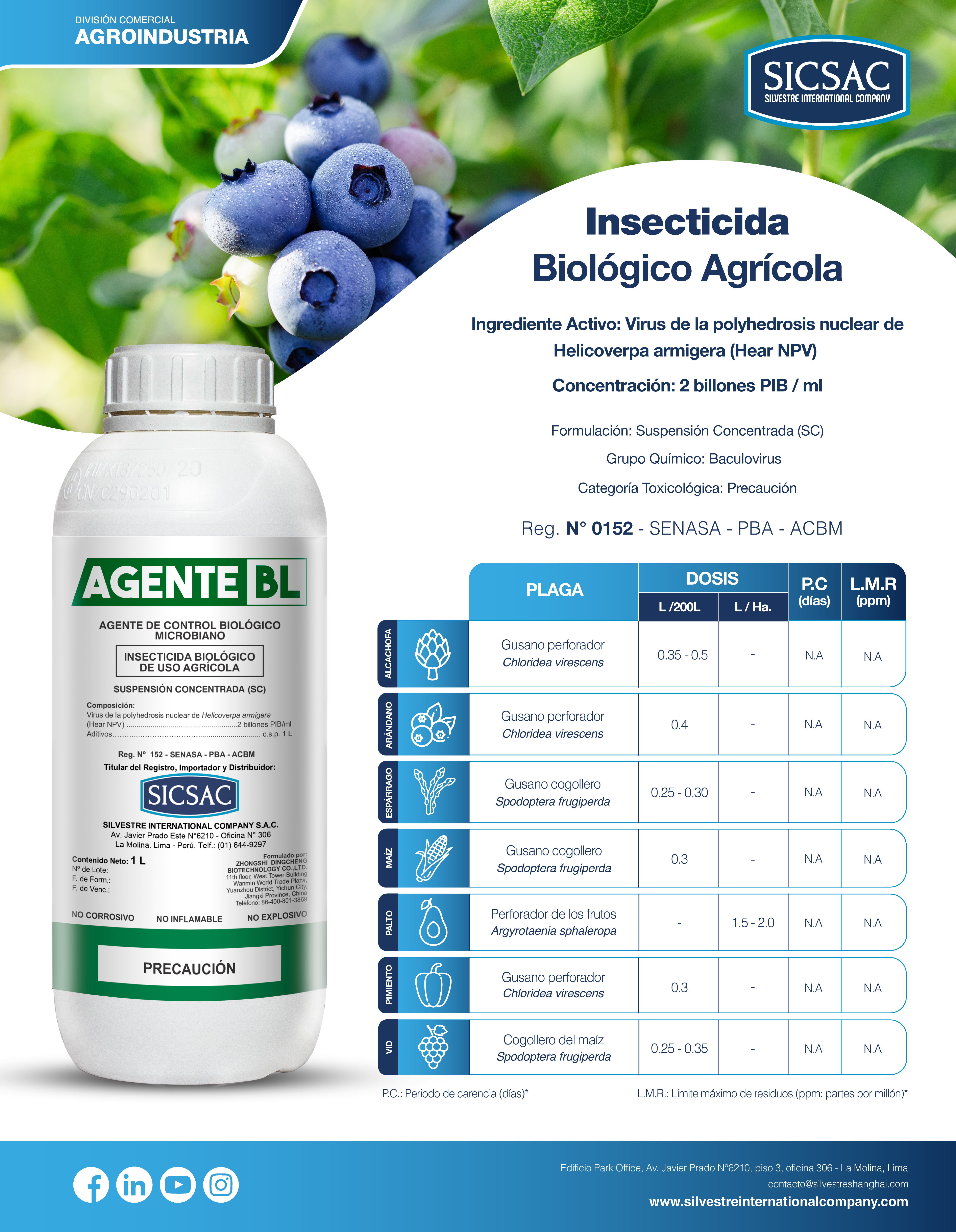 Insecticida biológico cuya composición es el Virusde la poliedrosis nuclear (NPV). Las hojas tratadas son ingeridas por las larvas, de esta manera el producto llega a su intestino, causando una infección viral que produce la muerte de la plaga.