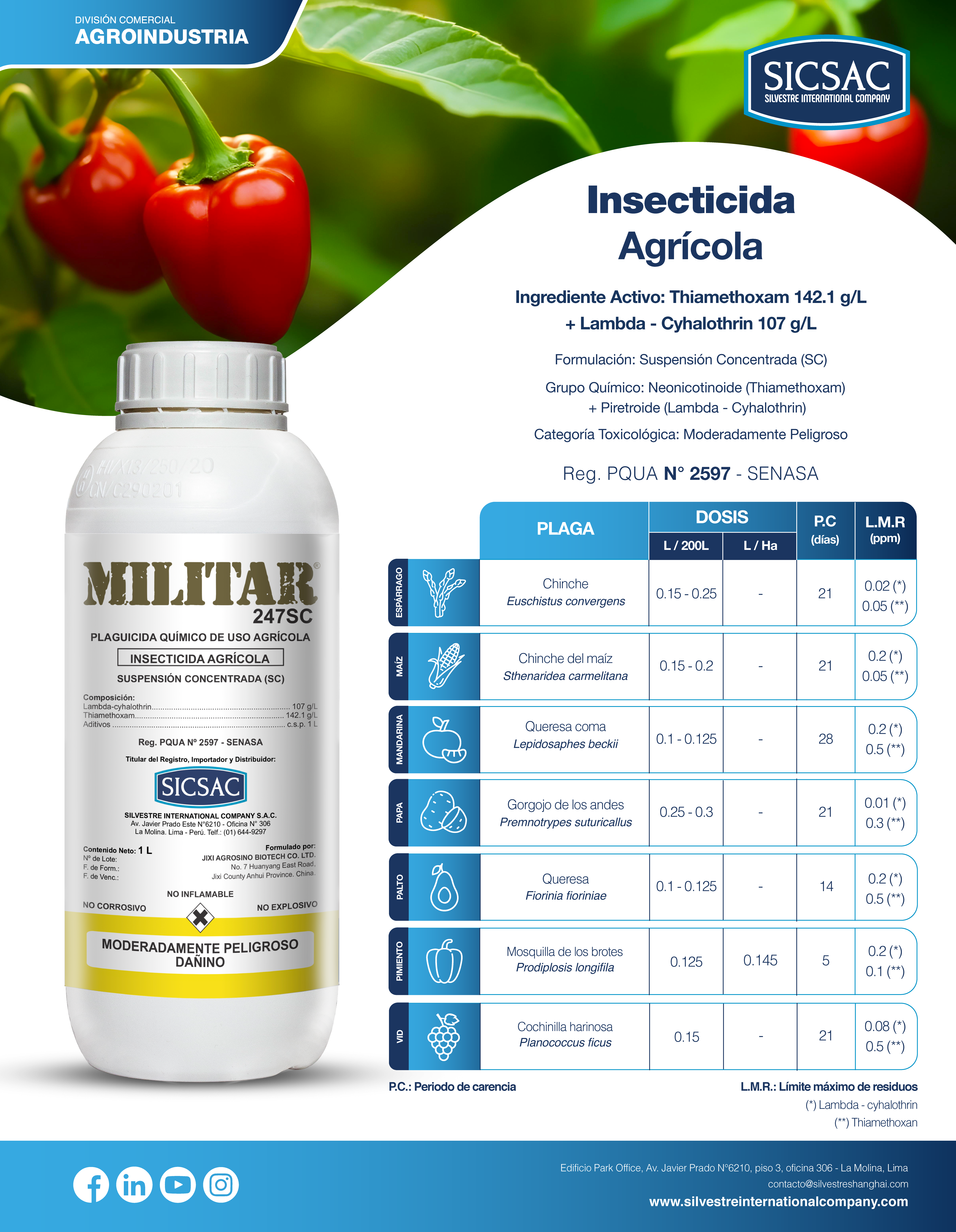 Insecticida con un marcado efecto de contacto e ingestión y de gran persistencia recomendado para el control de insectos minadores, masticadores y picadores chupadores.