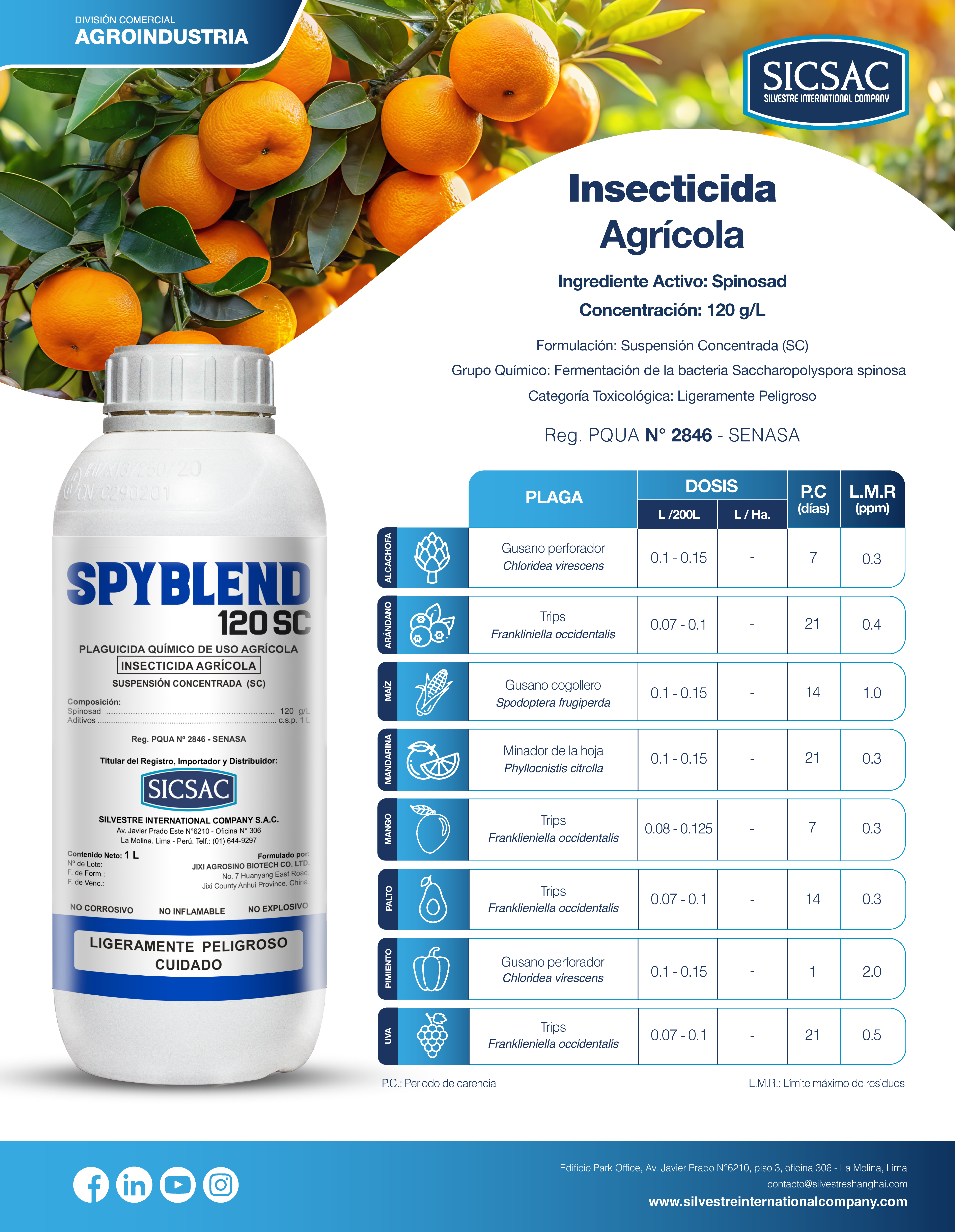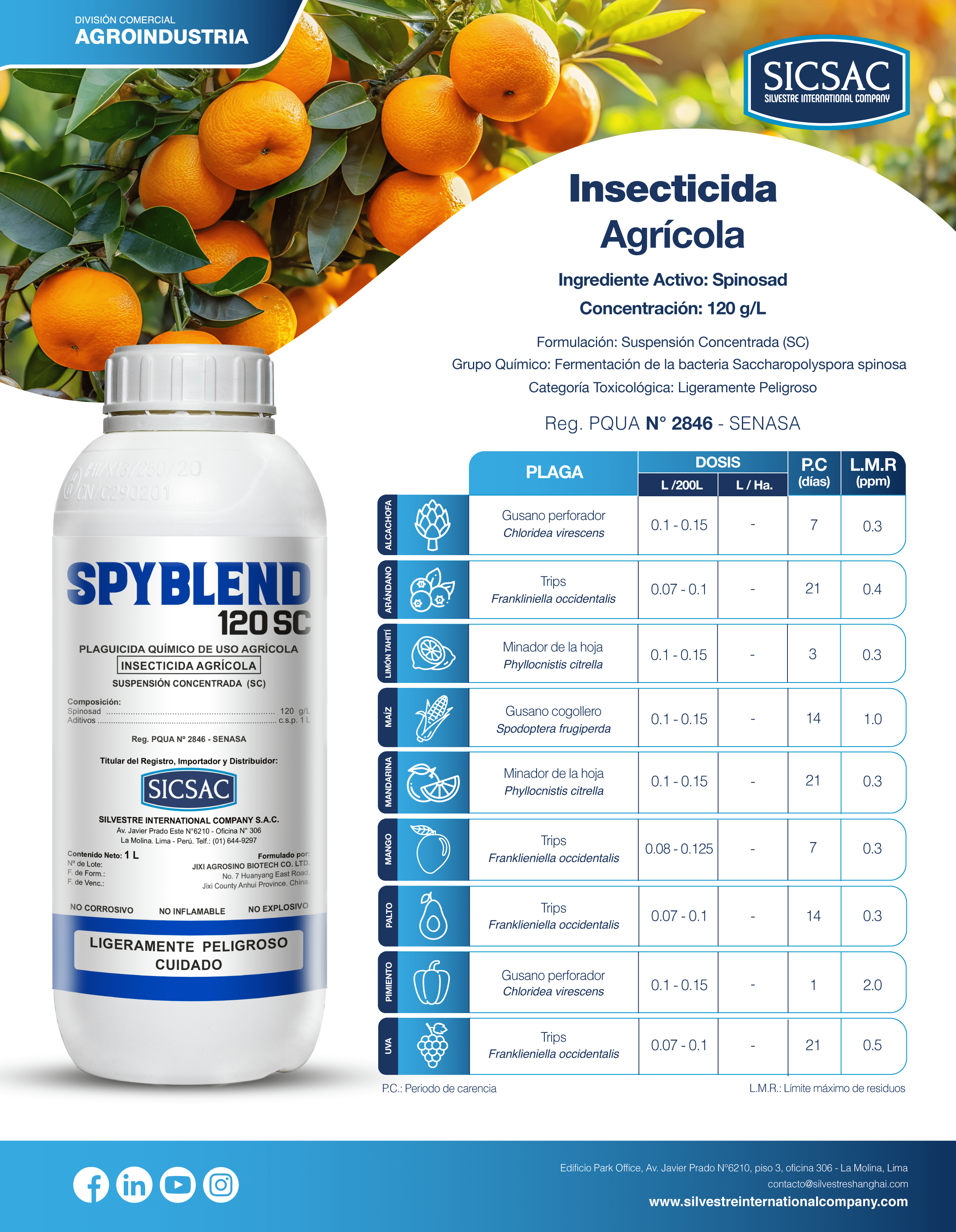 Insecticida de origen natural en base a bio tecnología, con un marcado efecto de contacto e ingestión, con un ligero movimiento translaminar para el control de insectos resistentes a otros modos de acción.